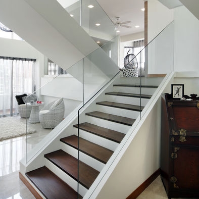 Thông thường chúng ta có thể thiết kế lan can bằng kính cường lực, bậc cầu thang bằng đá hoa cương hoặc lắp luôn bằng kính cường lực. Tuy nhiên, nếu thiết kế bậc cầu thang bằng kính cường lực rất dễ tạo cảm giác như bạn đụng đầu vào gầm cầu thang vậy, hoặc bạn cũng rất dễ va chạm vào thanh chắn cầu thang. Vì vậy, nếu dùng gầm thì bạn nên thiết kế số bậc cao hơn 10 bậc nếu không sẽ rất thấp dễ bị đụng đầu.